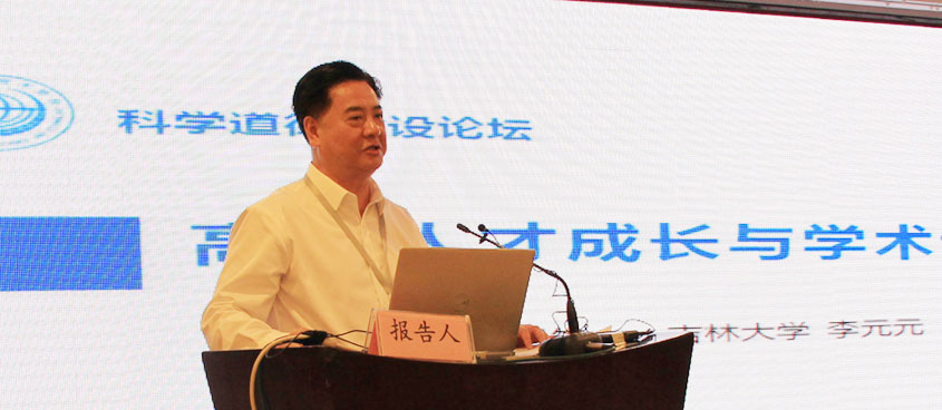 在论坛第一单元,北京大学副校长高松院士、吉大校长李元元院士、中国科学院大学副校长周琪院士和清华大学教授朱邦芬院士分别作了题为《诚实的学习—本科生诚信教育问题初探》、《高校人才成长与学术诚信建设》、《维护学术诚信体系,为建设世界科技强国保驾护航》和《我国学术诚信建设面临的新形势和治本治标之道》的专题报告。在论坛第二单元,国家自然科学基金委员会党组成员、副主任何鸣鸿,华中科技大学校长丁烈云院士分别作了题为《新型科研不端行为与案例分析》、《学术诚信的品德养成与法制建设》的专题报告。李元元在专题报告中从深化对学术诚信问题的认识、高校人才成长不同阶段的学术诚信问题分析、吉林大学学术诚信建设现状及成效、高校进一步加强学术诚信建设的对策等方面介绍了吉林大学的做法。