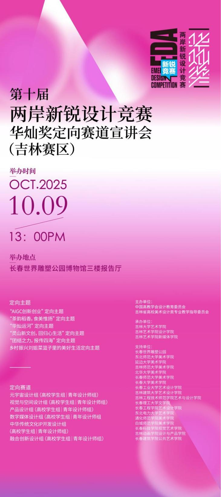 2025年10月9日,第十届两岸新锐设计竞赛"华灿奖"吉林赛区宣讲会在长春世界雕塑公园隆重举行。本次活动由中国高教学会设计教育委员会、吉林省教育厅美术设计类专业教学指导委员会主办,吉林大学艺术学院、吉林艺术学院设计学院、吉林艺术学院新媒体学院承办,宣讲会吸引了来自全省各设计院校的院长、学科带头人、设计专业师生代表200余人参加。吉林大学艺术学院副院长郑海标主持会议。