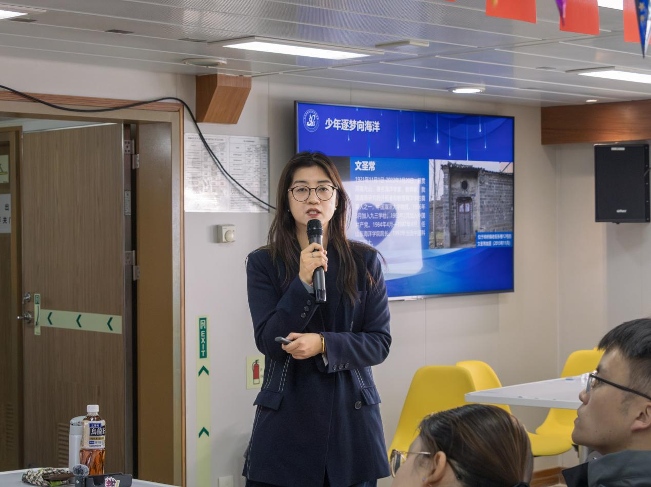 专题讲座环节,陈朝晖以“海洋科学与人类文明”为主题,通过海洋发展史、海洋观测与探测技术、海洋的多学科交融等内容的介绍,引导同学们关心海洋、了解海洋;中国海洋大学马克思主义学院党委副书记王付欣围绕“建设海洋强国与实现伟大复兴”这一主题,通过鲜活的案例阐明建设海洋强国的重大意义,增强师生对海洋强国战略的认识和理解,激励师生参与到建设海洋强国的征程中;中国海洋大学基础教学中心艺术系副主任宁燕以“听琵琶讲那过去的故事”为主题,用民族乐器琵琶弹奏了《大浪淘沙》《琵琶行》《霸王别姬》等经典曲目,为流动的“大思政课”注入美育元素,让师生在传统文化浸润中坚定文化自信;中国海洋大学新闻中心编辑袁艺以“浩海求索 丹心报国”为题,介绍了文圣常院士的先进事迹,全面展示了文先生对我国海洋科教事业的不懈追求、卓著成就和无私奉献,引导师生以文院士为楷模,践行海洋强国使命。