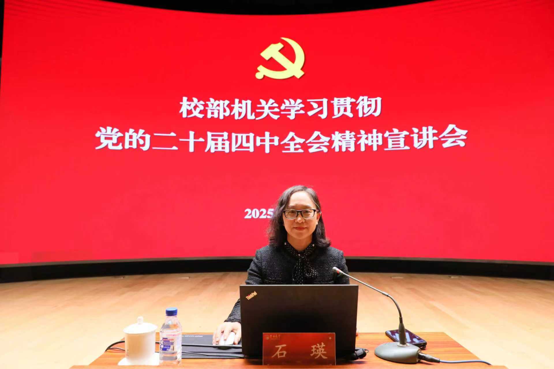 【供稿:校部机关党委】为深入学习贯彻党的二十届四中全会精神,按照学校党委部署要求,校部机关党委协同党委组织部、党委宣传部,组织开展学习贯彻党的二十届四中全会精神系列宣讲,12月31日,校部机关党委邀请学校专家宣讲团成员、学校课程思政教学研究中心主任石瑛教授作专题报告。宣讲会由机关党委书记兼党委组织部副部长张蓼红主持。