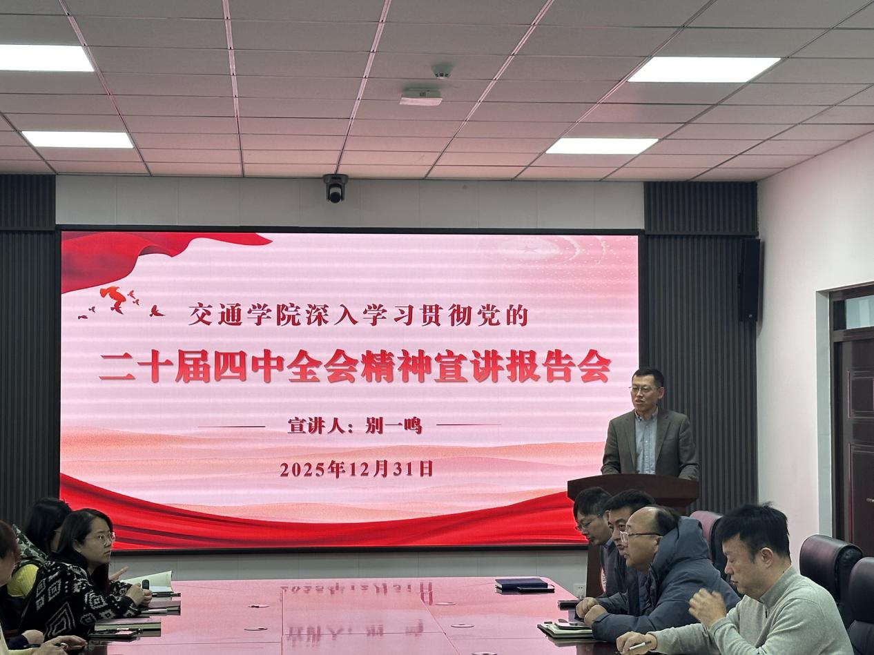 【供稿:交通学院】为深入学习贯彻党的二十届四中全会精神,准确领会国家“十五五”规划的战略部署,2025年12月31日上午,交通学院举办专题宣讲会,邀请吉林大学学习贯彻党的二十届四中全会精神专家宣讲团成员、交通学院院长别一鸣教授作专题宣讲报告。会议由学院党委书记李善兴主持。