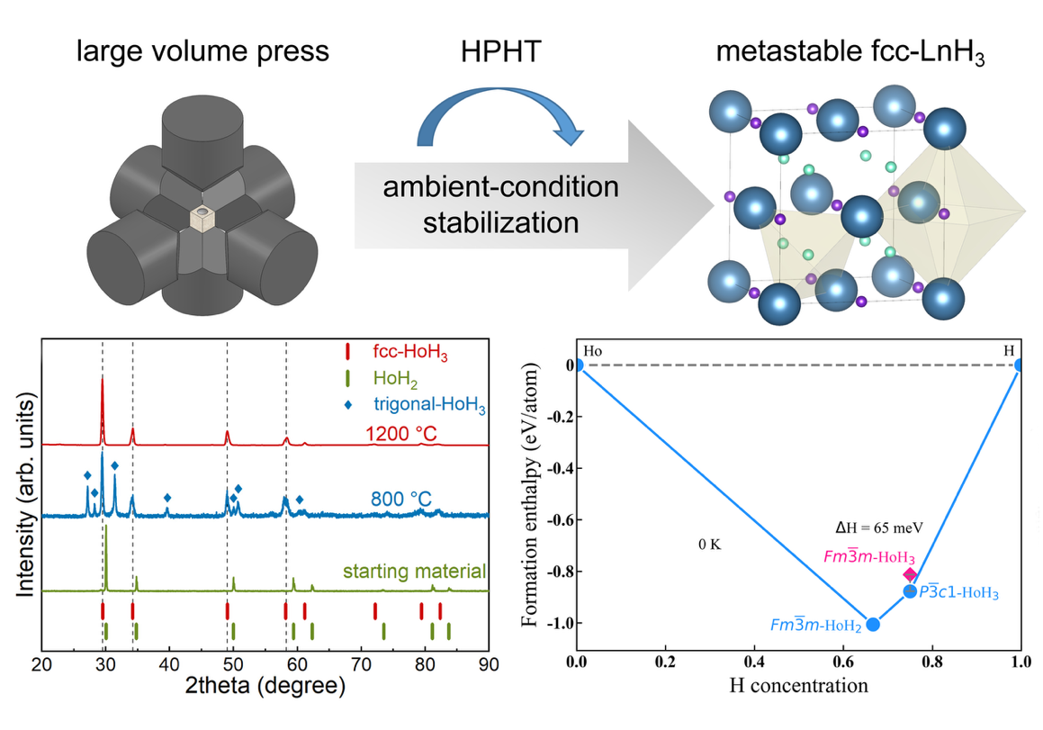 氢化物在高压条件下往往会出现新的结构相与物性,但不少高压相在卸压过程中会回变为常压稳定相,甚至发生分解,从而限制了其在常压环境下的系统表征与进一步研究。针对这一难点,研究团队以稀土二氢化物(LnH2)为前驱体,采用氨硼烷作为可控固体氢源,在大腔体压机(LVP)高温高压条件下实现受控氢化,并通过优化压力-温度-时间(P-T-t)路径,将原本仅在高压下出现的亚稳面心立方(fcc)LnH3相截获并保留至室温常压。