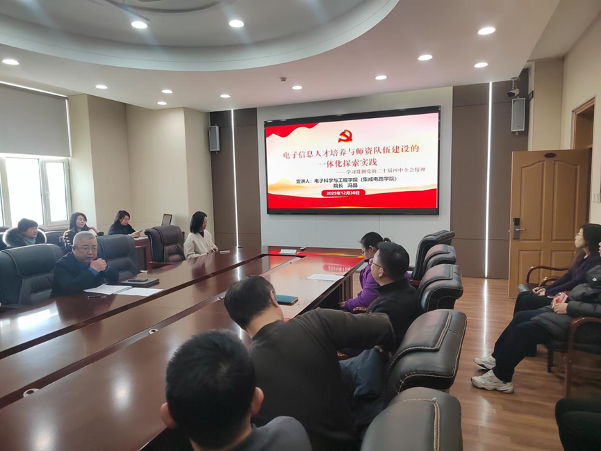 【供稿:电子科学与工程学院、集成电路学院】2025年12月30日,电子科学与工程学院(集成电路学院)举办学习贯彻党的二十届四中全会精神宣讲会。学校宣讲团成员、学院院长冯晶教授面向班子成员、全体系主任、党支部书记及行政管理人员作专题宣讲,深刻阐释全会的重大意义、精神实质和实践要求,进一步凝聚全院共识、激发奋进力量。学院党委书记蔡志刚主持会议。