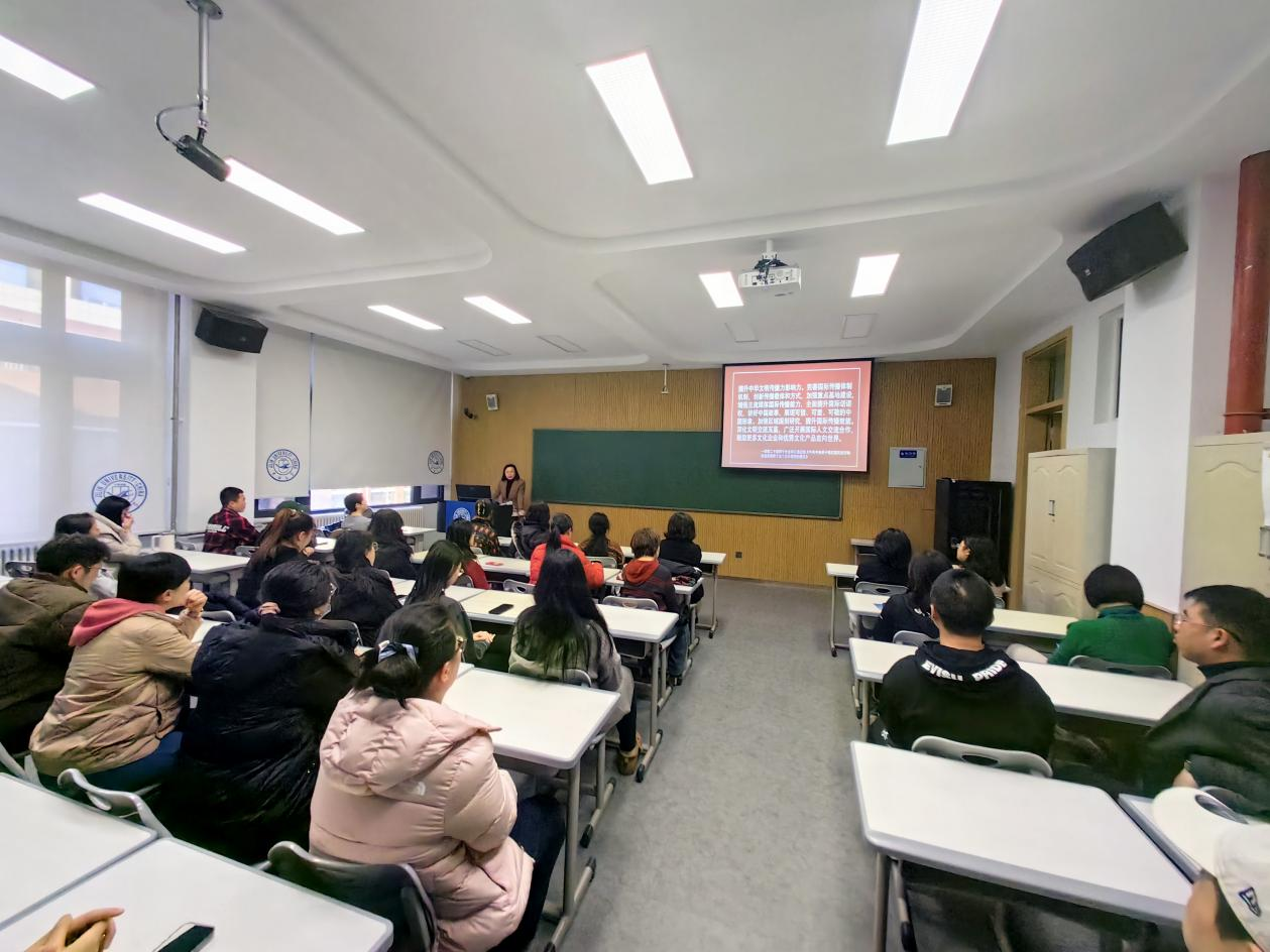 【供稿:外国语言文化学院】为深入学习领会、贯彻落实党的二十届四中全会精神,精准把握全会关于繁荣发展社会主义文化、提升中华文明传播力影响力的战略部署,1月19日下午,吉林大学外国语言文化学院举办学习贯彻党的二十届四中全会精神专题辅导报告会。吉林大学学习贯彻党的二十届四中全会精神专家宣讲团成员、外国语言文化学院院长潘海英教授以“以党的二十届四中全会精神为引领,构建具有世界影响力的中国叙事体系”为题作辅导报告。会议由院党委副书记兼副院长陈慧羲主持,学院师生代表参加会议。