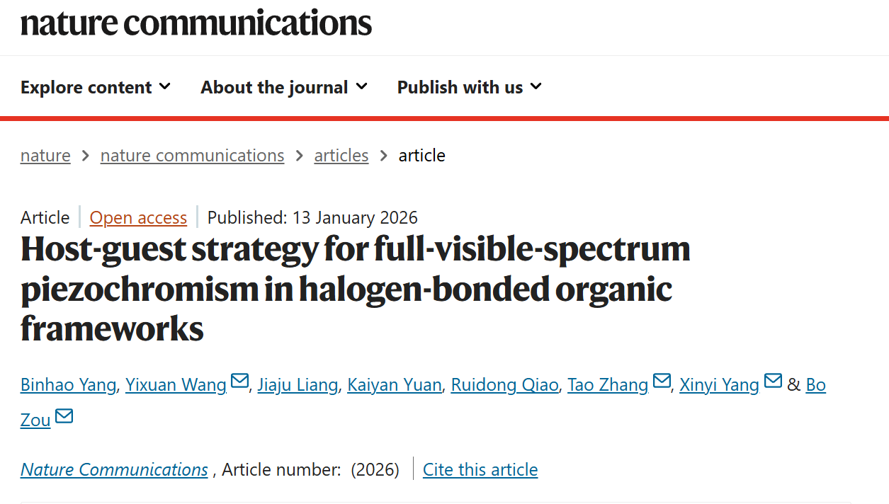 【供稿:物理学院】近日,吉林大学物理学院高压与超硬材料全国重点实验室/综合极端条件高压科学中心邹勃教授团队杨新一教授课题组与吉林大学中日联谊医院张涛副教授等人合作,在全可见光谱压致变色领域取得重要突破。通过主客体策略抑制高压下芳香稠环客体的结构无序,实现了主客体卤键有机框架(XOF)材料XOF@AD从深蓝色到红色的全可见光谱压致变色。相关成果以“Host-guest strategy for full-visible-spectrum piezochromism in halogen-bonded organic frameworks”为题发表在《Nature Communications》上。