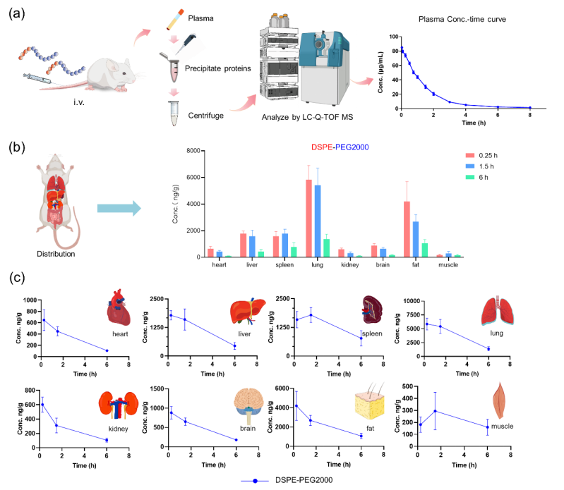 研究证实,DSPE-PEG2000可快速消除,特异性分布于肺、肝、脾;可激活补体系统与炎症因子应答,但不诱发适应性免疫抗体、无明显组织损伤;体内经酯酶水解后,PEG2000经肾脏排泄且以主链随机裂解方式降解。