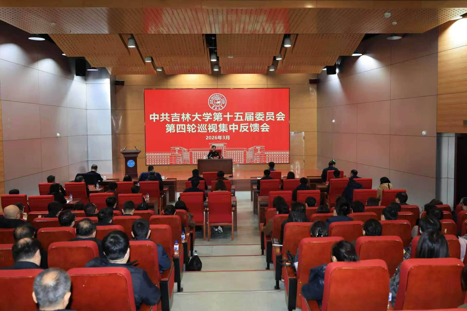 【供稿:党委巡视工作办公室】3月20日,中共吉林大学第十五届委员会第四轮巡视集中反馈会议在中心校区国际大讲堂召开。会议传达了校党委书记田辉在听取第四轮巡视情况汇报时的讲话精神,通报了巡视发现的主要问题,对巡视整改工作进行全面部署。党委副书记、纪委书记,国家监委驻吉林大学监察专员,党委巡视工作领导小组副组长胡漫参加会议并讲话,党委副书记、组织部部长姚毓春,纪委副书记刘晓昌,党委宣传部部长王庆丰参加会议。会议由党委巡视工作办公室主任白宇主持。