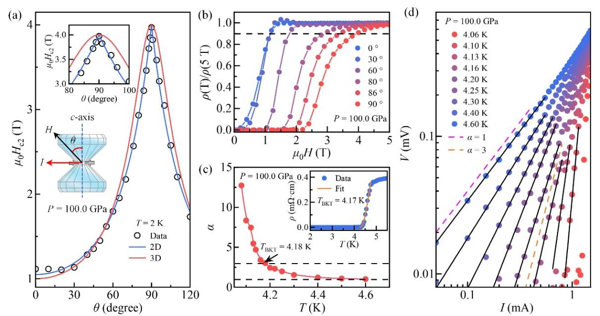 图2. 在100.0 GPa压力下,BKT转变及角度分辨上临界场分析表明,SC-II相仍保持显著的2D特征。