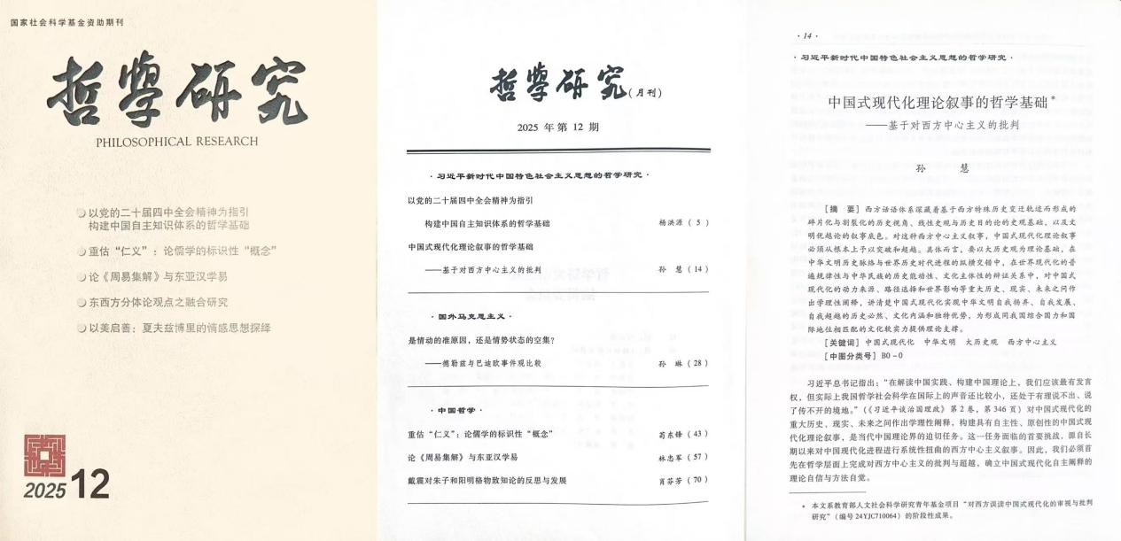 【社会科学研究院】近日,吉林大学马克思主义学院孙慧副教授在《哲学研究》2025年第12期发表题为《中国式现代化理论叙事的哲学基础——基于对西方中心主义的批判》的文章。文章直面构建中国式现代化理论叙事的首要挑战,即西方话语体系围绕中国的现代化进程构建的霸权性思维框架和知识体系,立足大历史观,在分析批判西方误读中国式现代化的历史视角、史观基础和叙事底色的基础上,构建从根本上突破和超越西方中心主义叙事,彰显中华文化主体性的理论框架,为对中国式现代化的重大历史、现实、未来之问作出学理性阐释提供方法论支撑。