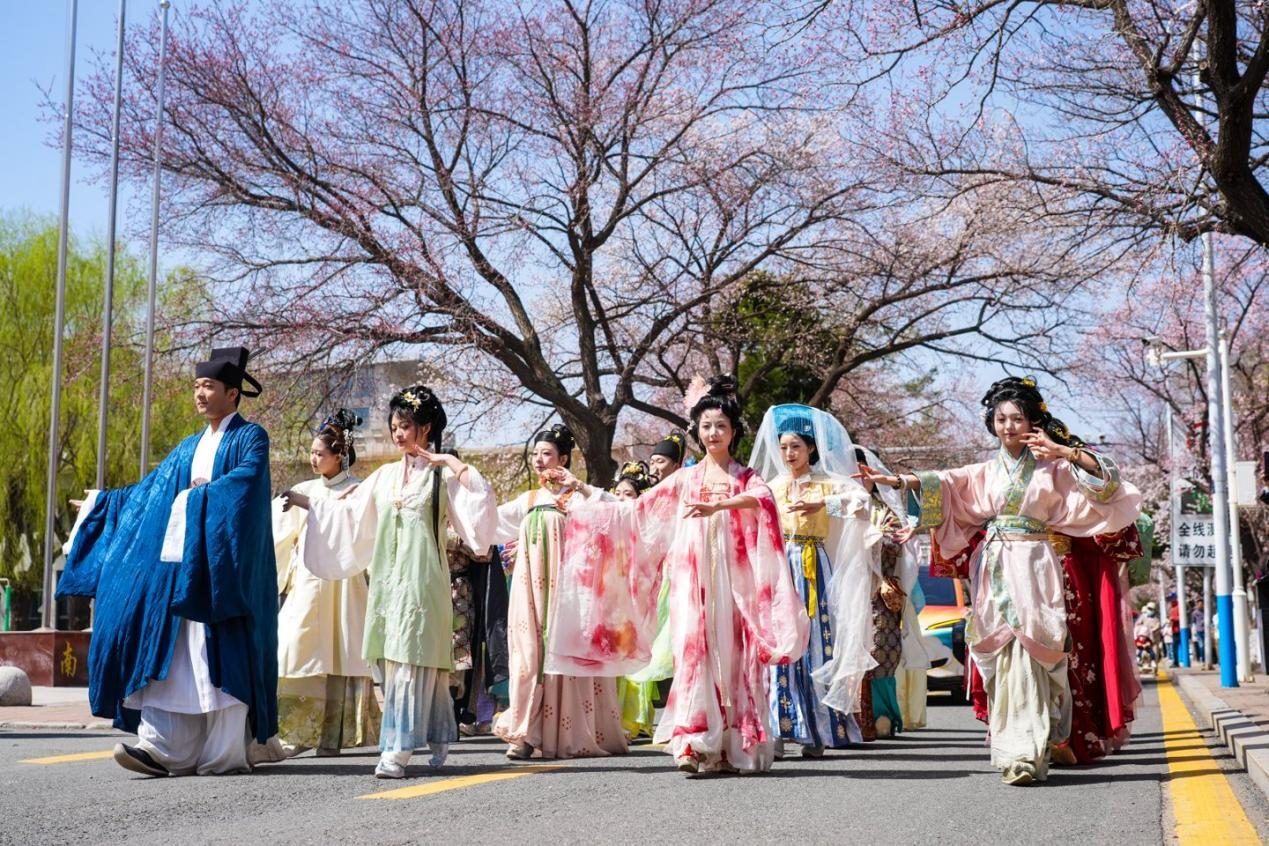 活动当天,南岭校区杏花大道春意盎然。身着华服的巡演队伍穿行于花海之间,并在杏树下即兴起舞,衣袂翩跹,与落英缤纷的杏花相映成趣。校外游客热情高涨,纷纷举起手机争相拍照。师生们徜徉花海,赏花、观舞、品华服,沉浸式感受中华优秀传统文化的魅力。