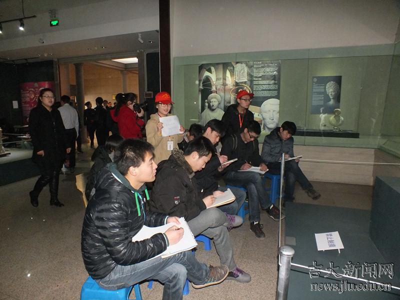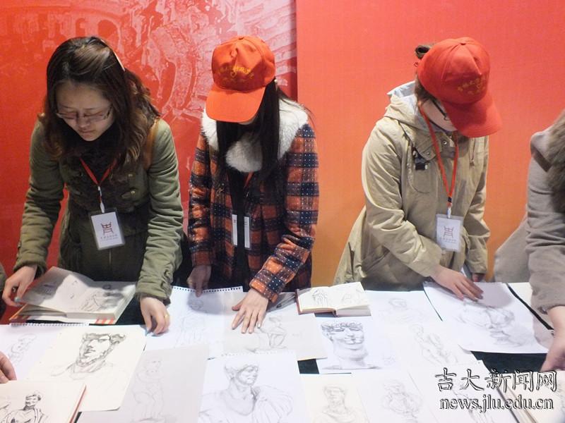 在老师的建议下,同学们选择好自己喜爱的雕塑模型,架起画板、拿好画笔,开始了现场临摹。临摹过程中,有的志愿者尝试着与聋哑同学进行简单的交流与沟通,为他们素描提供可行的建议;有的耐心为聋哑学生指引方向,提供座椅等物品;有的则维护现场秩序,保障本次活动的顺利进行,同时保护文物安全。