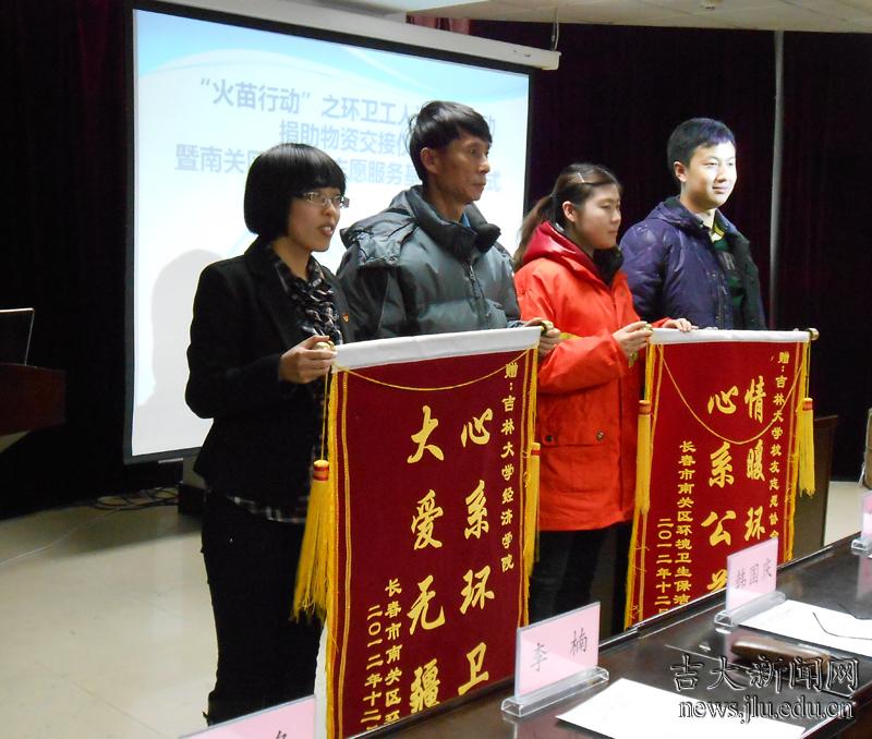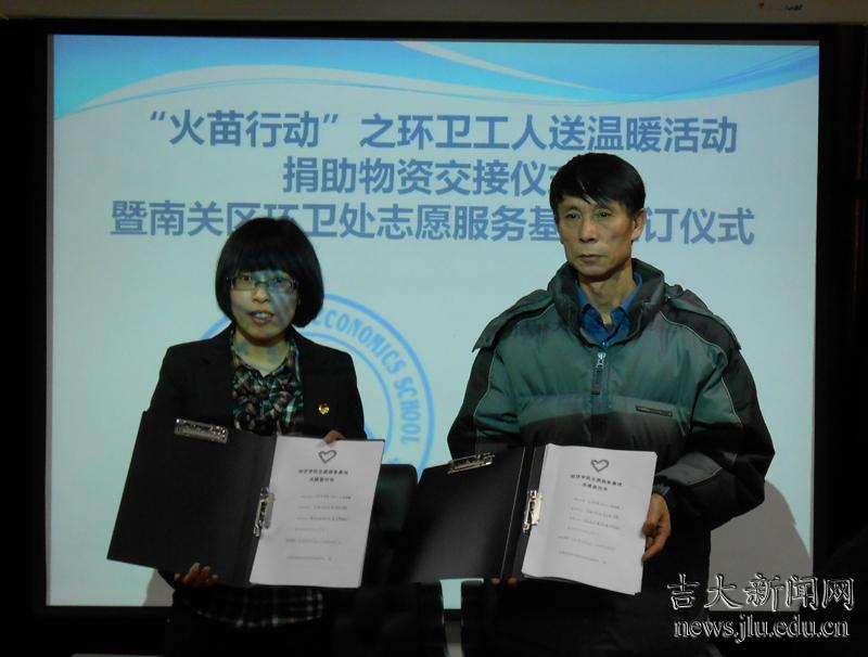 12月7日,由吉林大学经济学院团委主办的“火苗行动”之环卫工人送温暖活动捐助物资交接仪式在吉林大学中心校区举行。共青团吉林大学经济学院委员会书记刘柏岩与南关区环境卫生保洁管理处主任韩国庆代表双方单位签订了志愿服务基地共建意向书。