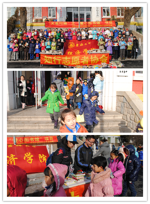 11月27日,按照十八大关注民生的精神,积极建设社会主义精神文明,吉林大学经济学院知行志愿者协会走进吉林大学附属中学小学部,号召小学生为贫困地区儿童捐赠图书。据悉,此次捐书仪式是由吉林大学经济学院团委牵头组织,长春市7所高校45个志愿服务社团联合开展的长春高校志愿服务活动“火苗行动”之一。“火苗活动”分为“爱心图书馆”“环卫工人送温暖”“行车路线指南”等系列活动,旨在把来自校园的力量奉献给全社会。知行志愿者协会作为经济学院的志愿者社团,参与并负责 “爱心图书馆”项目。