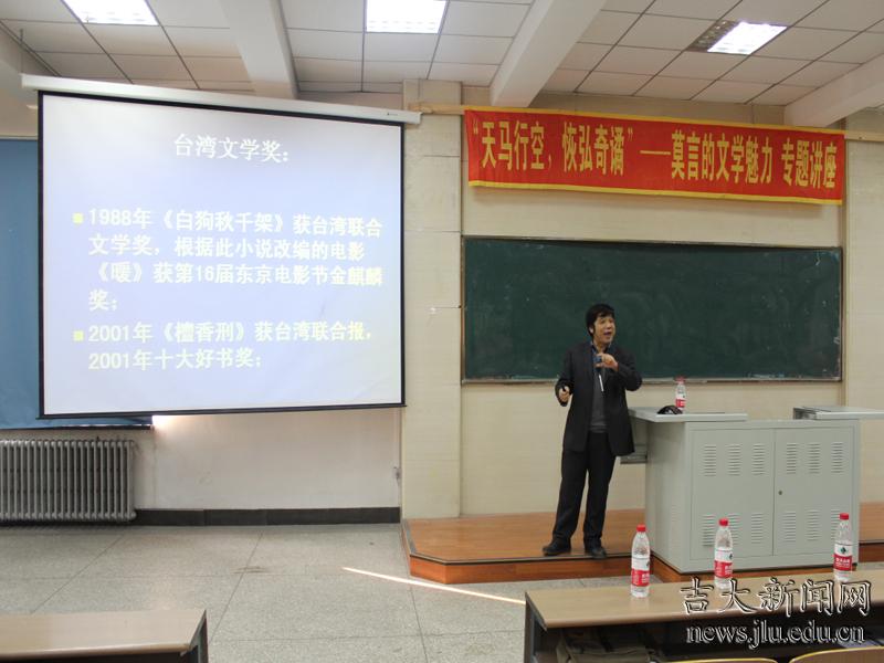 2012年的诺贝尔文学奖掀起了一股“莫言热潮”,吉林大学农学部于11月9日将“莫言热”搬入校园。文学院王学谦教授给大家做了“天马行空 恢弘诡谲——莫言的文学魅力”专题讲座。军需科技学院近400名师生一起倾听了此次讲座。