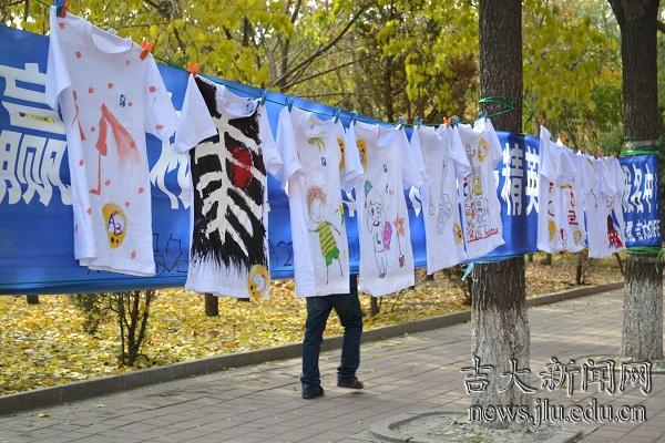 “绘我所喜,画我所爱”, 校园林荫道两旁挂满的文化衫将是这个冬季里一道独特的风景线。(吉林大学新闻网记者团 陈佳丽 见习记者 吴琼 孙康博)