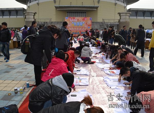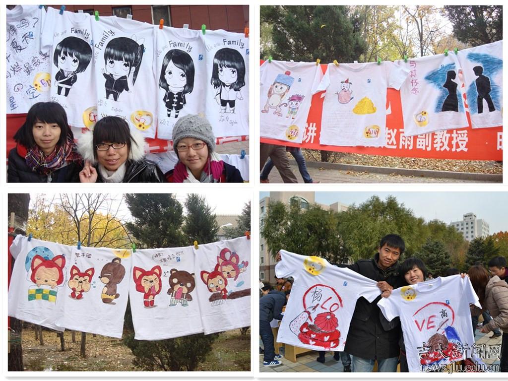 10月21日,吉林大学“天宝杯”第三届手绘文化衫大赛在体育馆北门举行。寒风难挡创意•青春•快乐的名义,活动陆续吸引了来自学校各个学院600余名同学的参与。