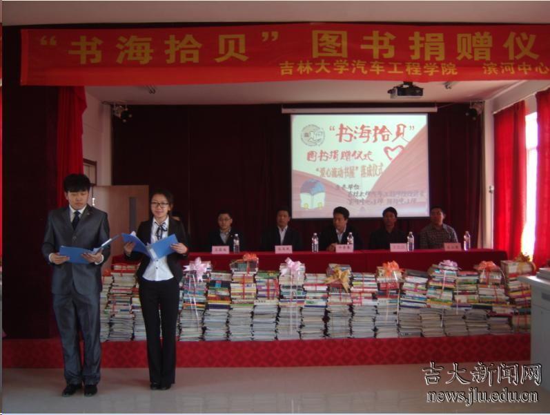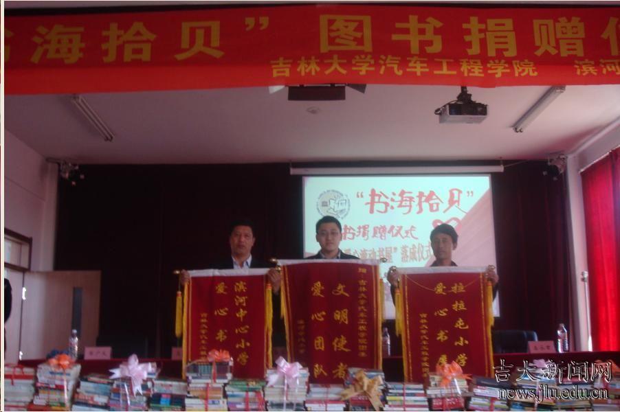 为纪念建团90周年,关爱农村教育事业,积极响应团省委“共青团关爱农民工子女志愿服务行动”、“流动书屋行动”的号召,努力培养优秀的团员、党员,为祖国发展做出贡献,吉林大学汽车工程学院于4月26日在农安县滨河中心小学举行了“书海拾贝”图书捐赠仪式暨滨河中心小学、拉拉屯小学爱心流动书屋落成仪式。