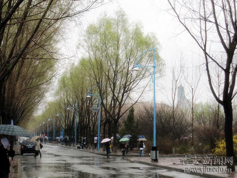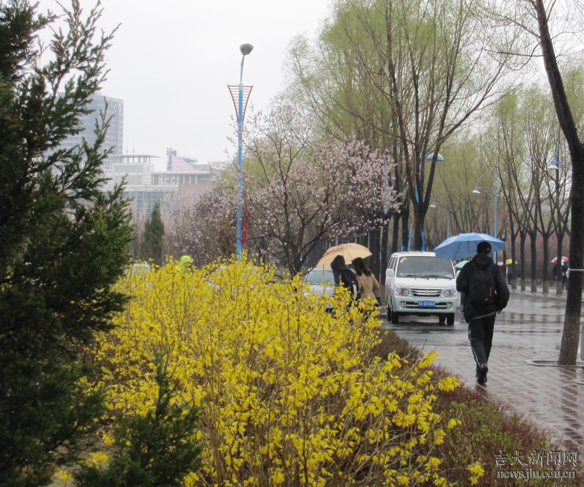 江南归来的校友说:“春天,长春的灰尘还是这么顽固。走在校园里,心情很特别。这是还没有离开校园,尚无多少人生阅历的人暂时无法完全体会的。”4月25日,一场细雨慢条斯理地冲刷着吉大校园,灰尘也暂时不见了,空气清新,花草鲜艳。
