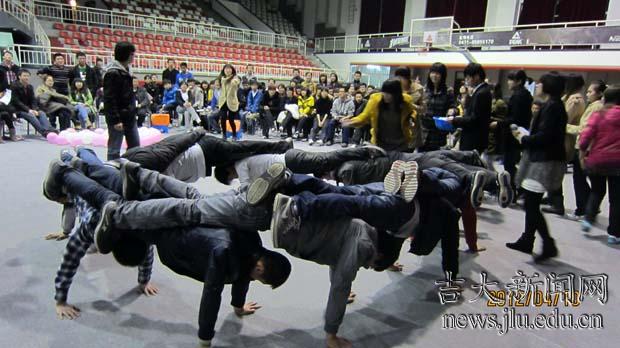 活动中难度最高的环节当数“丢纸团”。 各班派出10名男生,前一个男生双腿搭在后一个人的肩膀上,用手支地作俯卧撑状,围绕场中心的纸筒形成一个圆圈,在形成圈后,全班女生轮流将纸团投入纸筒中,总时间为三分钟。中途男生如有一人腿落地则宣布比赛告终,最后以纸团计数算分。“在比赛的时候,有女生为了更接近纸筒提高投中率而不小心踩到我的手,虽然很疼,但为了班级荣誉也就忍了。”参加比赛的男生张同学如是说。记者观察到,动物科学一班的一名男生在比赛中整个身体都趴到了地上,前一个同学的脚重重地压在他的头上,使他的脸紧紧地贴在冰凉的地上,但是因为比赛的时间还未到,他一直坚持到最后,脚始终没有放下来。活动结束后,在场的所有同学都为他及全体参赛男生热烈鼓掌。