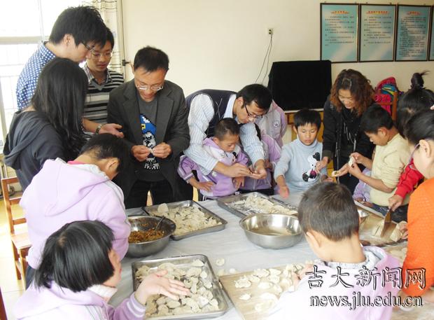 志愿者们刚进教室,就被孩子们包围了。“你好”,志愿者们用刚学会的手语和孩子们打起了招呼。接着,志愿者带着孩子们包起了饺子。“饺子馅儿放到适中就好,太多了会破的”“这个小朋友包得真好看” ……无声的语言不能妨碍心灵的交流,志愿者用手语、口型、表情、动作帮助和鼓励孩子们。一时间,教室里充满了欢乐。