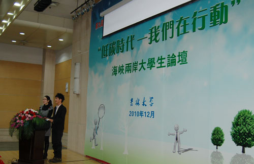 12月20日,吉林大学和台湾高校师生相聚在中心校区,参加第九届“北国风情冬令营”系列活动之“海峡两岸大学生论坛”,共议“低碳时代——我们在行动”。论坛由吉林大学丑则静和逢甲大学林钰伟联席主持。