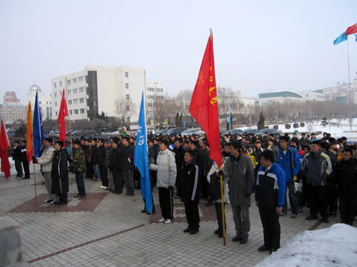 12月9日,纪念“一二•九”爱国运动长跑暨团旗传递活动在中心校区行政楼前正式开始,来自商学院、计算机科学与技术学院、文学院、经济学院、哲学社会学院等学院的近300名大一同学以学院为方阵,斗志昂扬地从行政楼出发,绕学校主干道路长跑传递团旗。