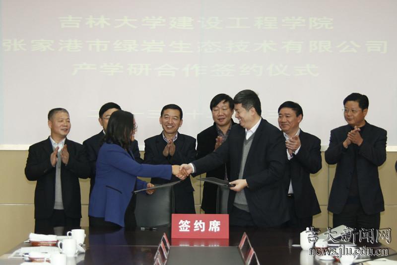 吉林大学建设工程学院院长孙友宏和张家港绿岩生态技术有限公司董事长王开秀代表双方签订“产学研用”合作协议。