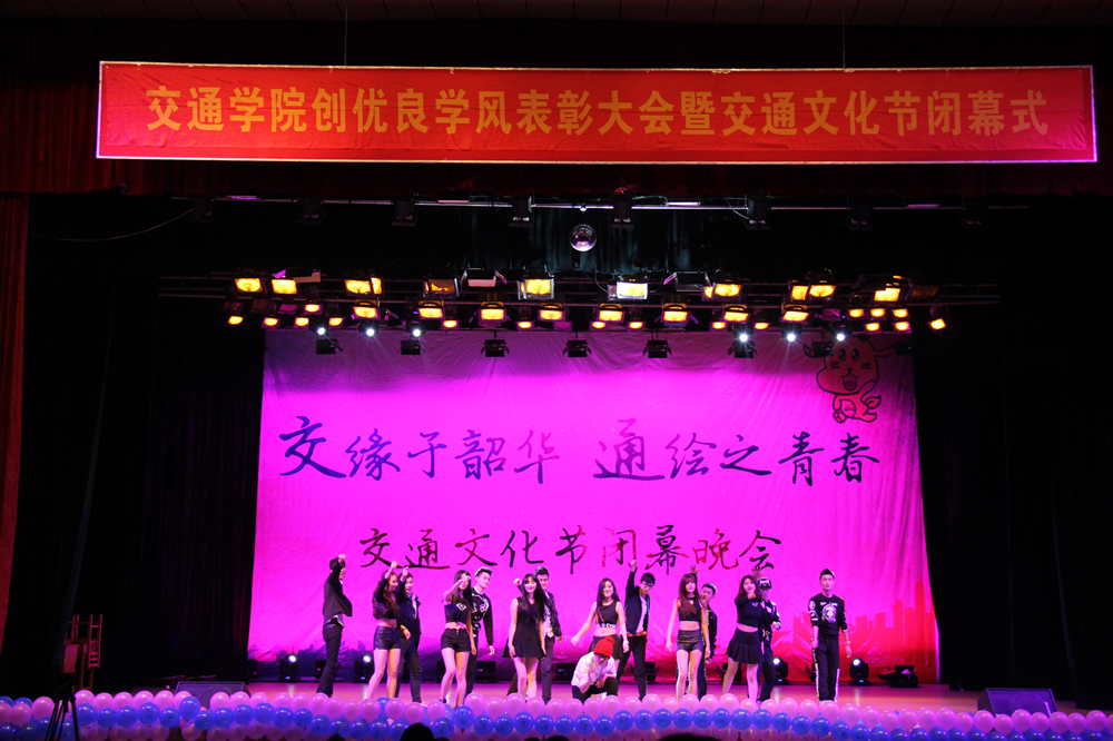 闭幕晚会在国歌的旋律中拉开大幕,交通学院党委副书记周志强宣读优秀学生和优秀班级获奖名单,并由交通学院院长刘寒冰为获奖者颁奖。随后,节奏感极强的开场表演cups串烧先声夺人,获得观众的阵阵掌声;大二学生刘韶杰带来的魔术表演出神入化,博得观众的阵阵惊呼和赞叹;小品《坷垃侠》、双人爵士舞以及脱口秀《暴走大事件》等节目给观众带来许多精彩瞬间;歌曲联唱唱出了歌手各自的风格和韵味;相声《我的朋友》幽默诙谐,将观众逗得捧腹大笑,使现场气氛也更活跃。伴随着压轴节目《dustep remix》的进行,晚会接近了尾声,舞者们用街舞的动感带动观众,更是走下台与观众亲密互动,撒出糖果,表达对观众的感谢之情。