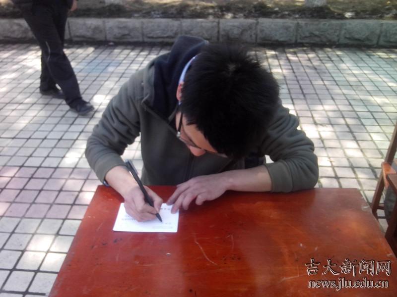 活动准备充分后,一部分同学向南湖游客介绍本次活动目的及流程,号召大家参与到活动中来,写下对山区孩子的祝福。同学们还进行了激情洋溢的公益活动宣讲,呼吁全民参与公益事业。在南岭校区,汽车工程学院的同学们又在南岭二餐门前继续爱心接力,希望同学们为山区的孩子献出当代大学生的关爱。