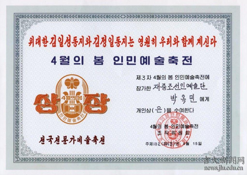 4月10日至18日,应朝鲜民主主义人民共和国政府邀请,艺术学院朴玉敏副教授参加了第三届朝鲜四月之春人民艺术节,并与来自中国、美国、日本、乌兹别克斯坦等10余个国家60多个艺术团体的上千名文艺工作者同台演绎。在个人单项节目的表演中,朴玉敏凭借扎实的唱功和超人的舞台表现获得银奖。(艺术学院)