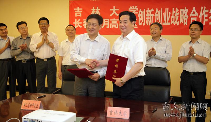 座谈会上,双方就共建大学生创新创业园和“互联网+”产业集聚园、校区创业合作体系、净月大学科技园、人才交流合作机制、对外交流及合作平台、工作协同体制等方面签订《吉林大学-净月高新区创新创业战略合作协议》。