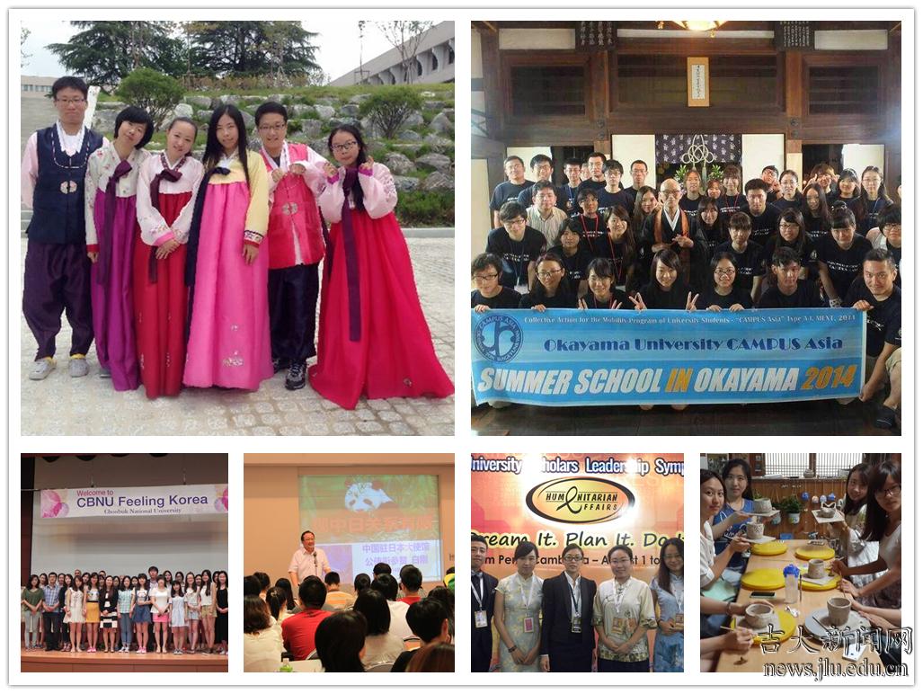 2014年暑期,吉林大学共派出56名学生赴韩国、日本、柬埔寨等亚洲国家参加为期一周到一个月不等的暑期项目,包括:成均馆大学国际暑期学校、釜庆大学暑期班、全北大学暑期班、仁荷大学暑期学校、忠南大学暑期班、江原大学暑期班等6个韩国项目,“亚洲校园”项目之冈山大学暑期班、早稻田大学短期交流项目、上智大学暑期班、西南学院大学暑期班等4个日本项目以及在柬埔寨金边举行的第五届“世界大学生领导者研讨会”共11个暑期项目。