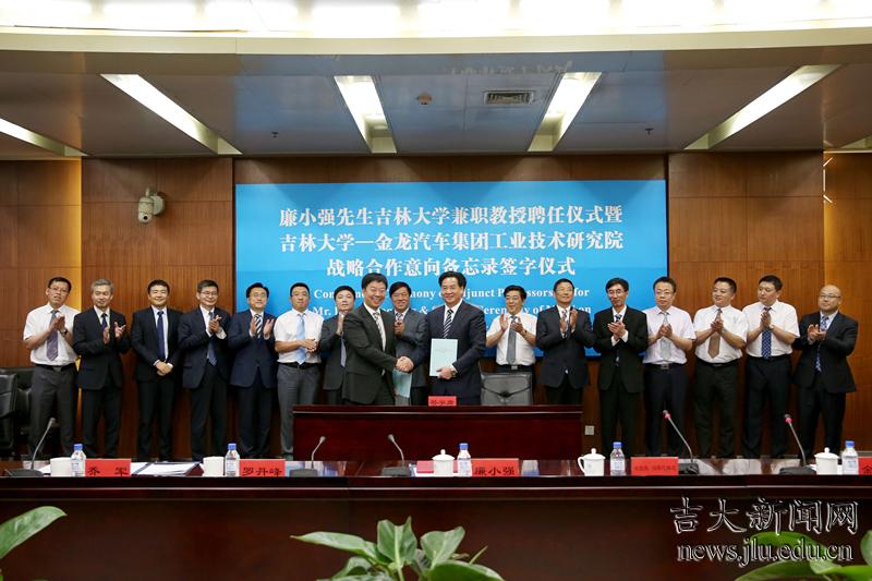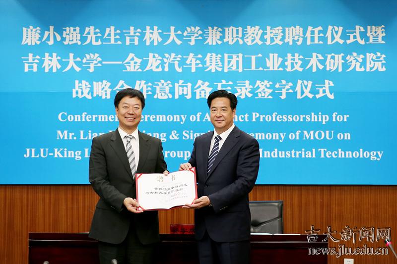 在廉小强先生吉林大学兼职教授聘任仪式暨吉林大学—金龙汽车集团工业技术研究院战略合作意向备忘录签字仪式上,陈岗介绍了吉大国际合作与交流情况。董德明介绍了吉大科研合作情况。李元元在致辞中提出,吉大要整合优势学科的优质资源,与金龙汽车集团密切配合,积极助力金龙集团的科技进步,同时提升学校的科研创新能力和人才培养水平,力争成为校企合作的典范,并提出未来双方在“互联网+”和汽车产业相结合的探索中展开合作。李元元对廉小强董事长扎实的学术功底、丰富的企业实战经验和对母校深厚的感情给予充分肯定,希望他作为吉林大学的兼职教授为母校的发展作出更大贡献。廉小强在致辞中感谢母校的培养,并表示将以吉林大学—金龙汽车集团工业技术研究院为依托,围绕金龙汽车集团“一个核心,两条路线”的新战略,与吉林大学各相关学科领域开展务实合作。随后,李元元向廉小强颁发了吉林大学兼职教授聘书,佩戴了吉林大学校徽,并与廉小强一起签署《吉林大学—金龙汽车集团工业技术研究院战略合作意向备忘录》。聘任和签字仪式由刘德斌主持。