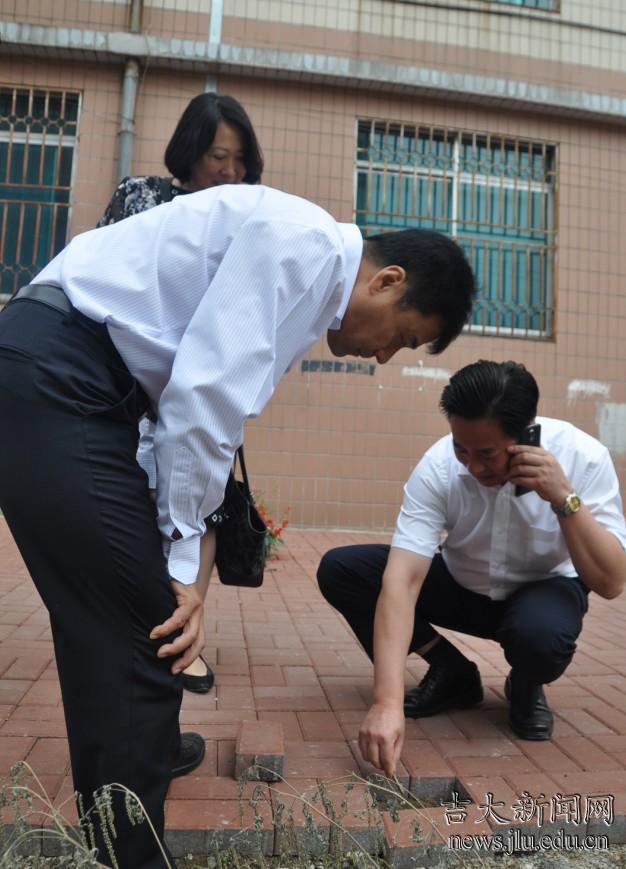 沿着图书馆的围墙,步行在新疆街上。李元元看到学生五公寓墙外围铺的地砖还有“半拉子工程”便停了下来,迅速电话叫来新民后勤服务中心负责人询问,催促尽快完工。