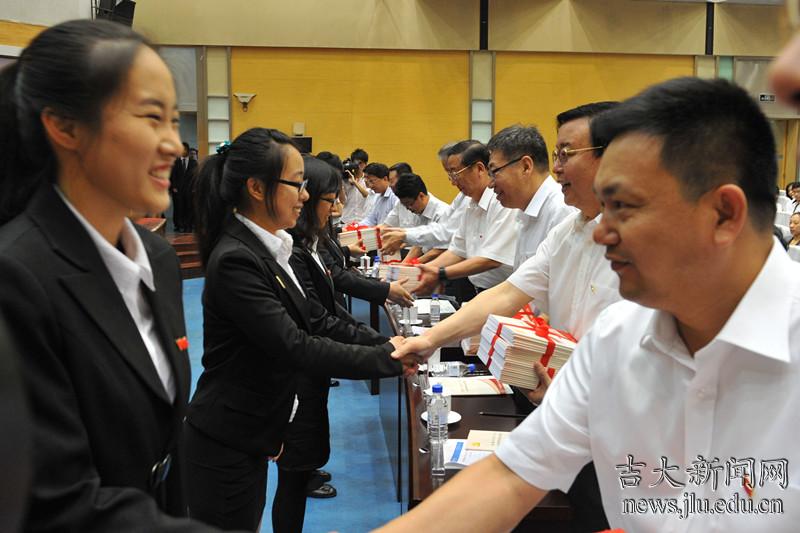 刘晓民代表学校宣读了《吉林大学致2013届毕业生党员的一封信》,希望全体毕业生党员要学会“知致意诚、正心修身”、要牢记“孝悌爱敬、齐家治国”、要立志“振兴中华、胸怀天下”,继续秉承“求实创新、励志图强”的吉大精神,为实现“国家富强、民族复兴、人民幸福”的伟大中国梦而不懈奋斗。参会嘉宾向毕业生党员赠送了饱含学校领导、学术名师、辅导员、在校学生和学生家长的嘱托与期盼的饯行礼物。