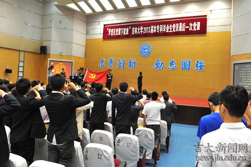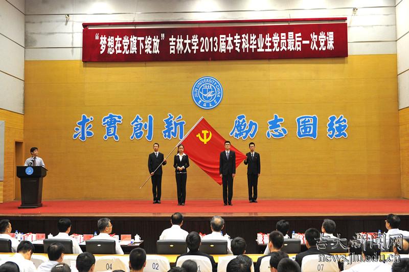 6月17日,吉林大学“梦想在党旗下绽放”2013届本专科毕业生党员最后一次党课在中心校区举行,校党委副书记兼纪委书记刘晓民,学校相关职能部门负责人,各学院主管学生工作副书记、毕业生辅导员及毕业生党员代表参加了本次活动。本次活动旨在庆祝建党九十二周年,深入学习贯彻党的十八大和第二十一次全国高校党建工作会议精神,大力推动德育创新,进一步加强毕业生党员教育,激励毕业生党员坚定信念、凝聚力量,为实现伟大“中国梦”而不懈努力。