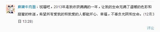 麻辣牛肉面:祝福吧,2013年是我收获满满的一年,让我的生命充满了温暖的色彩和甜蜜的味道,希望所有爱我的和我爱的人都能开心、幸福,不辜负光阴和生命。(12月3日 13:28)