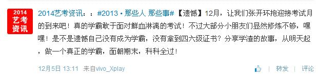 2014艺考资讯::#2013 • 那些人 那些事# 【遗憾】12月,让我们张开环抱迎接考试月的到来吧!真的学霸敢于面对鲜血淋漓的考试!不过大部分小朋友们显然修炼不够,嘿嘿!是不是遗憾自己没有成为学霸,没有拿到四六级证书?分享学渣的故事,从明天起,做一个真正的学霸,面朝期末,科科全过!