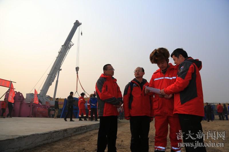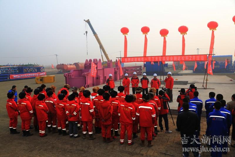 21日上午,大雾渐渐散去。松科井场举行简短庆祝仪式,国家深部探测技术与试验专项办公室主任陈宣华教授、“地壳一号”万米钻机课题组负责人、远程运输总指挥孙友宏教授、松辽盆地大陆科学钻探指挥部孟庆鸿主任等分别致辞。仪式后,钻机吊装工作正式开始。