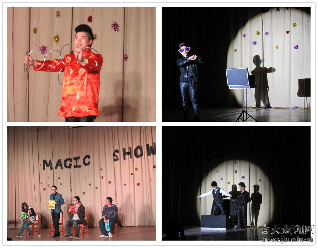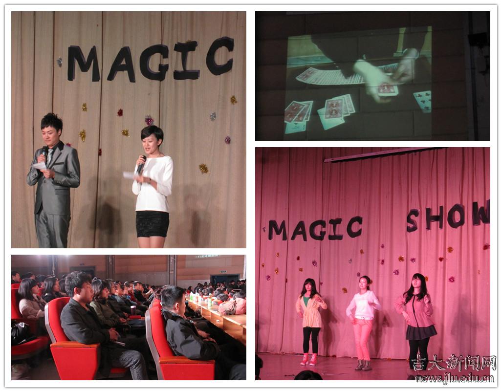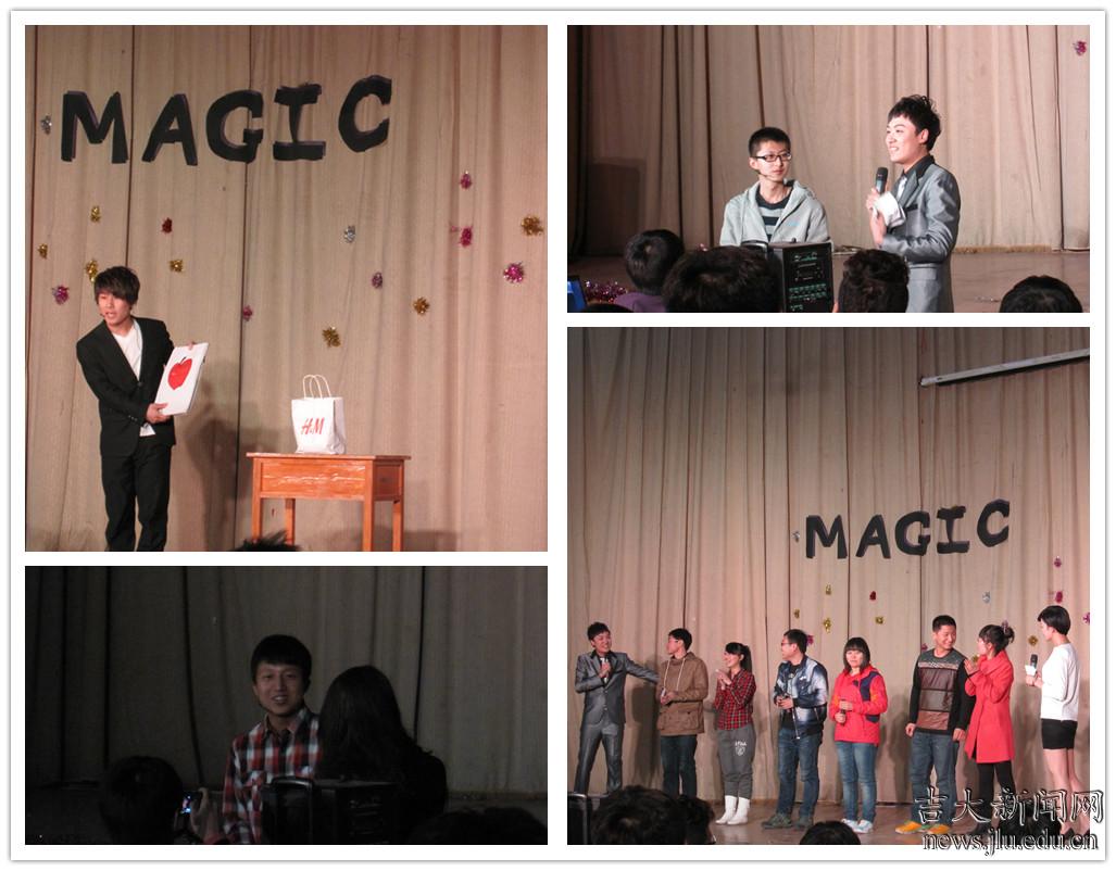 4月17日,吉林大学中心校区经信报告厅灯光闪耀、人头攒动。吉大学子三五结伴地早早来到现场,抢占会场前排视角极佳的座位。彩排阶段,主持人和文艺演出人员各就其位,几位身着黑色礼服、发型新潮的人疾走如风,已经到场的观众就开始伸长脖子,期待从工作人员的忙碌中找出一些蛛丝马迹。仿佛那些平日里寻常的桌椅、箱子、瓶罐都被染上了一层异样的色彩……“梦想之夜 魔幻盛典”的字幕揭开了这一系列神秘氛围的面纱。