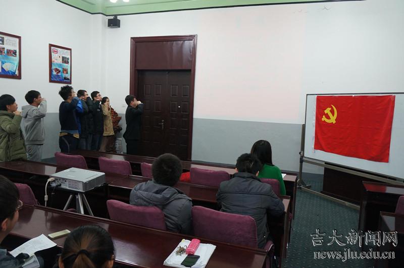 12:30,吉林大学朝阳校区地质宫208室内,《义勇军进行曲》的节奏拉开了仪器科学与电气工程学院纪念“一二•九”爱国运动78周年暨入党宣誓仪式的序幕,学院本科生党支部全体党员、入党积极分子及9名新发展的党员面对党旗庄严宣誓。