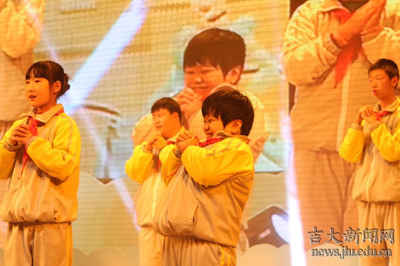 “我们的成长”环节, 5位参赛选手带着孩子们在台上做游戏、教孩子唱歌、与孩子一起合唱《童年》,台上大手拉小手,台下阵阵掌声不断。梦幻的灯光、灿烂的笑脸、弥散的温情驱散了冬日的寒冷,温暖了每个人的心房。活动现场还播放了此次活动的策划者之一、正在与白血病顽强抗争、永远以积极乐观的正能量感染着身边人的吉林大学艺术学院大四学生高子阳的场外视频。全场师生合唱《仰望星空》为高子阳送去鼓励和祝福。李元元也现场寄语高子阳,号召全校师生献爱心帮助他战胜病魔,并期待他早日回到大家身边。