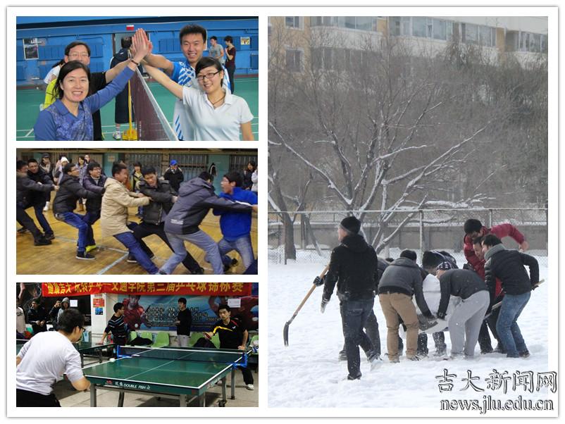 畜牧兽医学院的广播操比赛,整齐划一、动作优美;交通学院的冰雪嘉年华,造型独特、精彩绝伦;公共卫生学院的师生羽毛球对抗赛,球技精湛、配合默契;材料科学与工程学院的雪地拔河比赛,活力无限、趣味无穷;机械科学与工程学院的趣味运动会,设计巧妙、欢声不断;仪器科学与电气工程学院的学生毽球公开赛,斗智斗勇、险象环生;建设工程学院的新生杯足球比赛,潇洒俊逸、扣人心弦;商学院的定向越野大赛,构思奇特、挑战连连;全校范围的“趣味素质拓展”精英挑战赛,赛制紧凑、角逐激烈……在吉林大学校团委的倡导下,学校各级团组织都积极响应,根据实际情况,号召广大青年学子、教职员工,积极邀请中老年教职工,纷纷开展主题鲜明的师生文体活动,增强学生体质,增进学子间友谊,活跃了校园文化氛围。