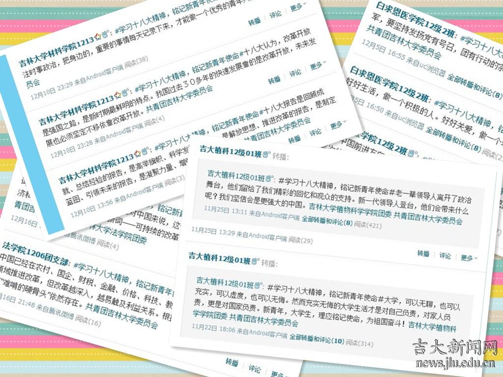 为组织、引导全校同学更好地学习党的十八大精神,吉林大学校团委和学生工作部联合开展了以“学习十八大精神,铭记新青年使命”为主题的千班万团微博学议十八大活动,掀起了全校大学生学习十八大精神的热潮。自11月19日活动开始,全校各学院班级团支部踊跃参与,以微博为平台,从专业视角发布和转发学习、评论十八大会议精神的微博信息,并积极参与校团委发起的微博投票和微博问答活动。截至12月中旬,吉林大学各校区同学共发布十八大相关微博信息3.8万余条,同时得到兄弟高校大学生网友的广泛好评和参与互动。