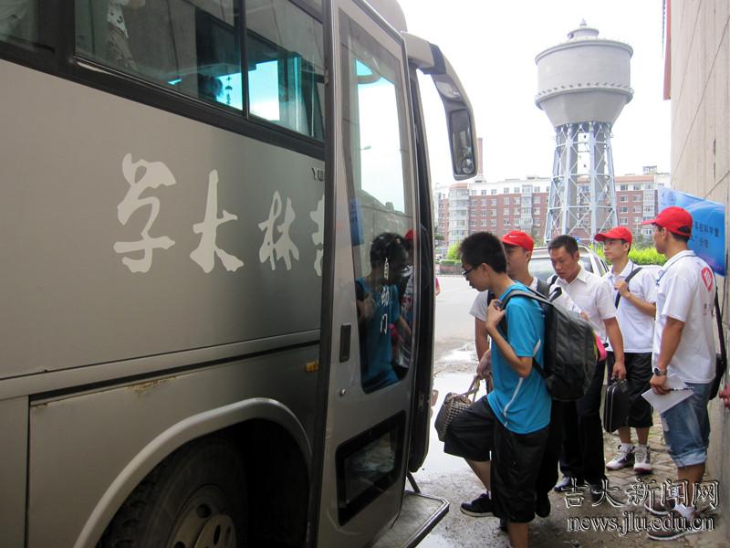 高中生们乘坐接站车前往吉林大学基础园区报到处