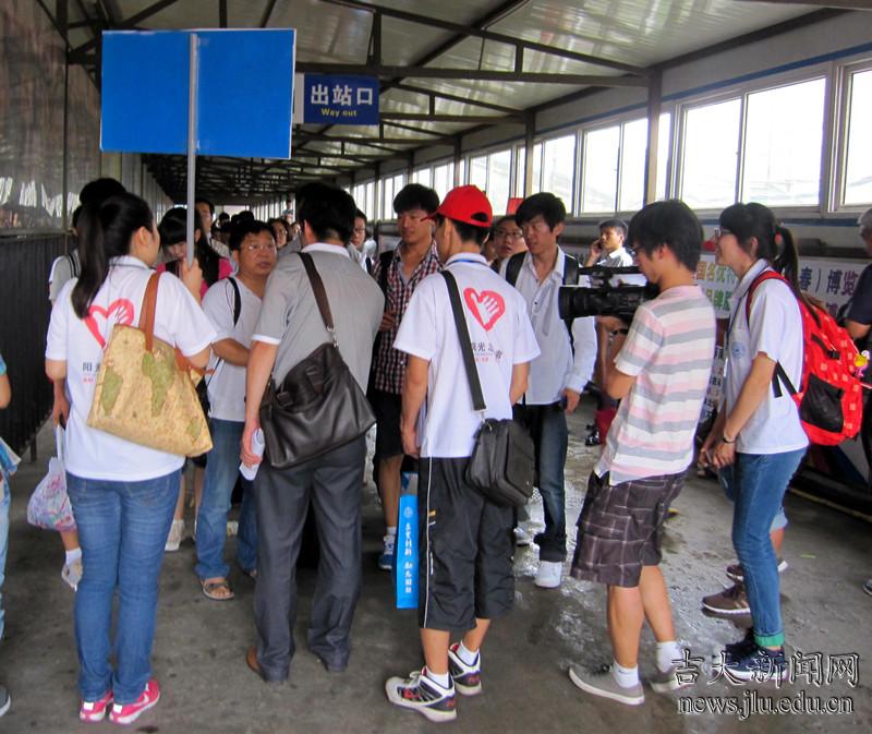 11:30,由白城方向开来的K7310次列车晚点近20分钟,提前半个小时就已经等候在出站口的志愿者们高高举起接站牌焦急地等待着来自白城和松原的20余名优秀高中生们。会合后,志愿者们核对人数和分组,并带着大家乘接站车抵达吉林大学基础园区报到处。