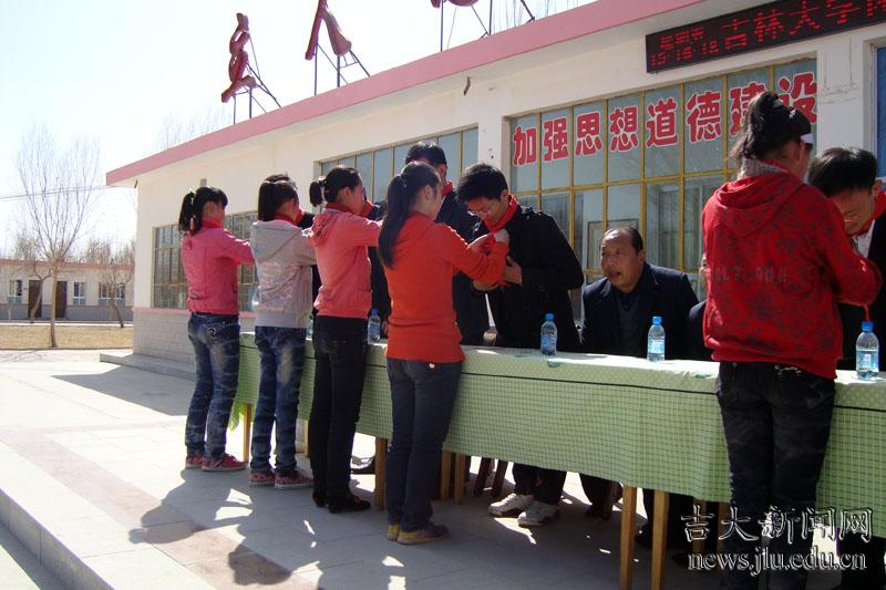 王兴和吉林大学第十三届研究生支教团团长林栋共同为吉林大学阳光爱心学校敦煌分校揭牌。孟家桥中学小学部少先队员为支教团志愿者佩戴红领巾,甘肃服务队全体8名成员被聘任为敦煌阳光爱心学校教师。