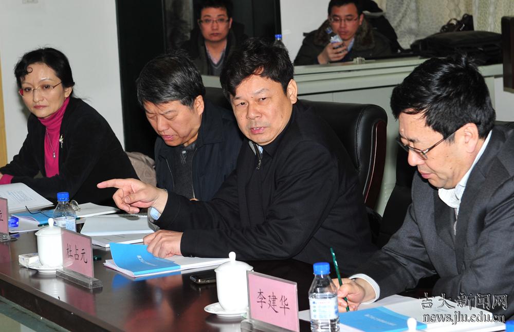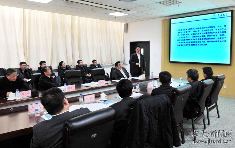 在汇报会上,李元元简单介绍了吉林大学的基本情况和2012年大力推动管理体制改革所取得的成就以及2013年要开展的重点工作,着重就学校“十一五”以来科研创新情况和目前正在申报的大科学工程建设以及协同创新工作向杜占元一行作了详细汇报。在介绍学校大科学工程建设时,李元元重点汇报了前期工作基础、已开展的工作、省市地方政府的大力支持和面临的主要问题,强调了吉林大学大科学工程建设的科技优势和吉林省及长春市所具备的区域优势,希望能够得到教育部的重点支持。
