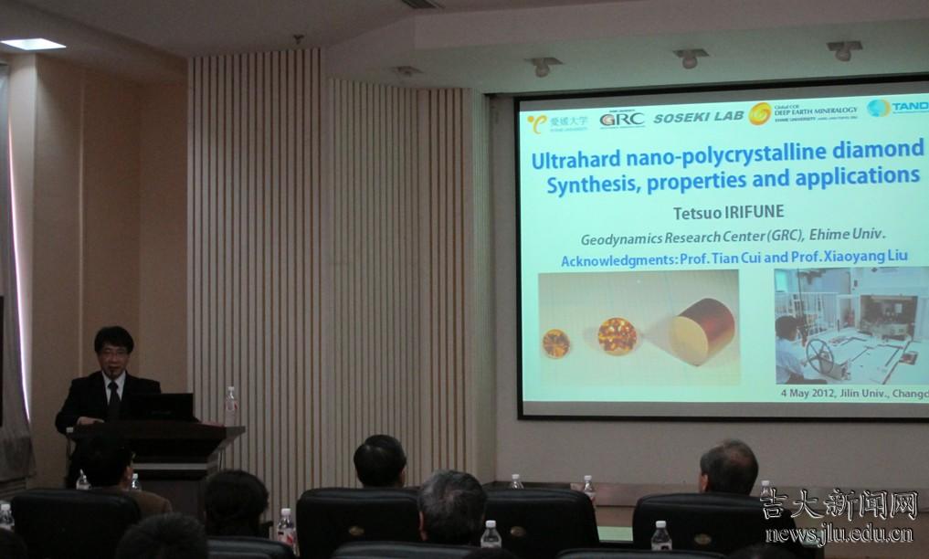 访问期间,日本爱媛大学地球深层动力学研究中心主任入舩徹男参观了无机合成与制备化学国际重点实验室,并与冯守华院士进行了座谈。代表团全体成员还访问了超硬材料国家重点实验室,入舩徹男作了题为“超硬多晶钻石:合成、特性和用途”的学术报告,邹广田院士、实验室主任崔田及百余位师生参加了报告会。据悉,入舩徹男2011年当选为国际超高压科技协会(AIRAPT-22)主席,其带领的地球深层动力学研究中心团队于2011年10月利用合成的超硬金刚石成功制作了直径7.5mm的金刚石真球体。