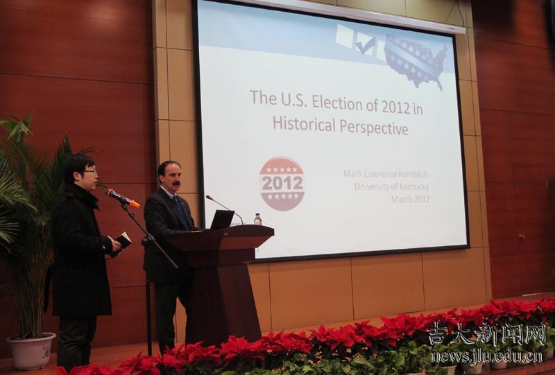 马克•科恩布鲁还为吉大师生作了题为“2012年美国大选的历史透视”的学术报告,深入分析了美国总统选举的历史演变过程,并与吉大国际关系研究所的中外师生就相关问题进行了热烈讨论。此场报告是吉林大学——肯塔基大学系列学术报告的第一讲。